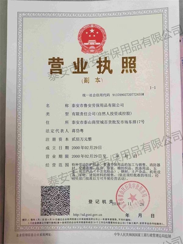泰安市魯安勞保用品有限公司是一家從事勞保用品、勞保用品批發(fā)的企業(yè),同年,經(jīng)主管安全生產(chǎn)的有關(guān)部門(mén)批準(zhǔn)同意,經(jīng)營(yíng)銷(xiāo)售特種勞動(dòng)防護(hù)用品
